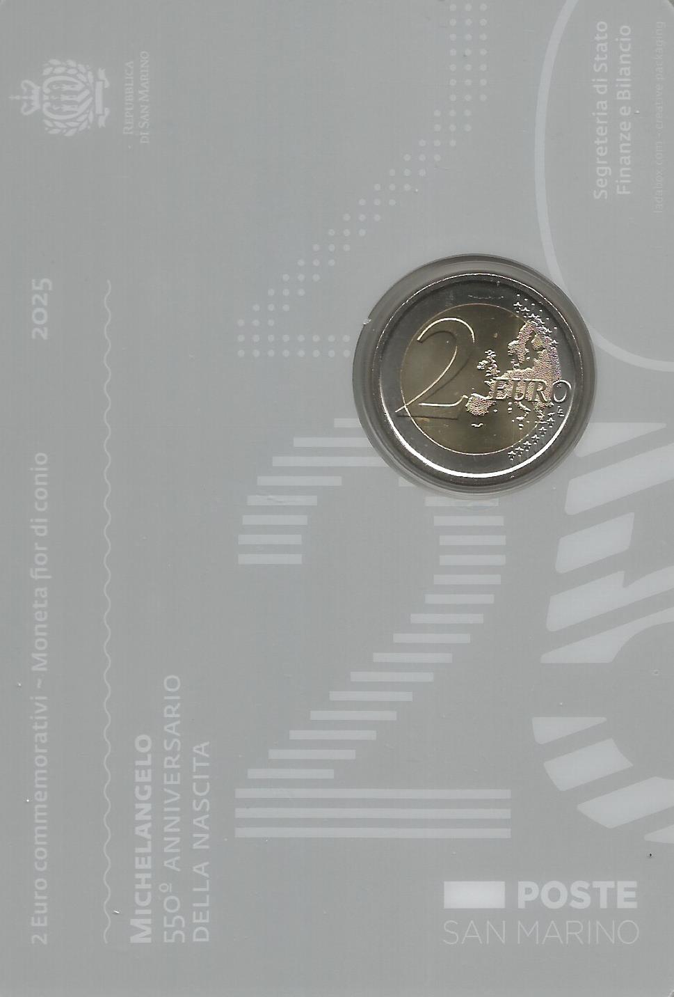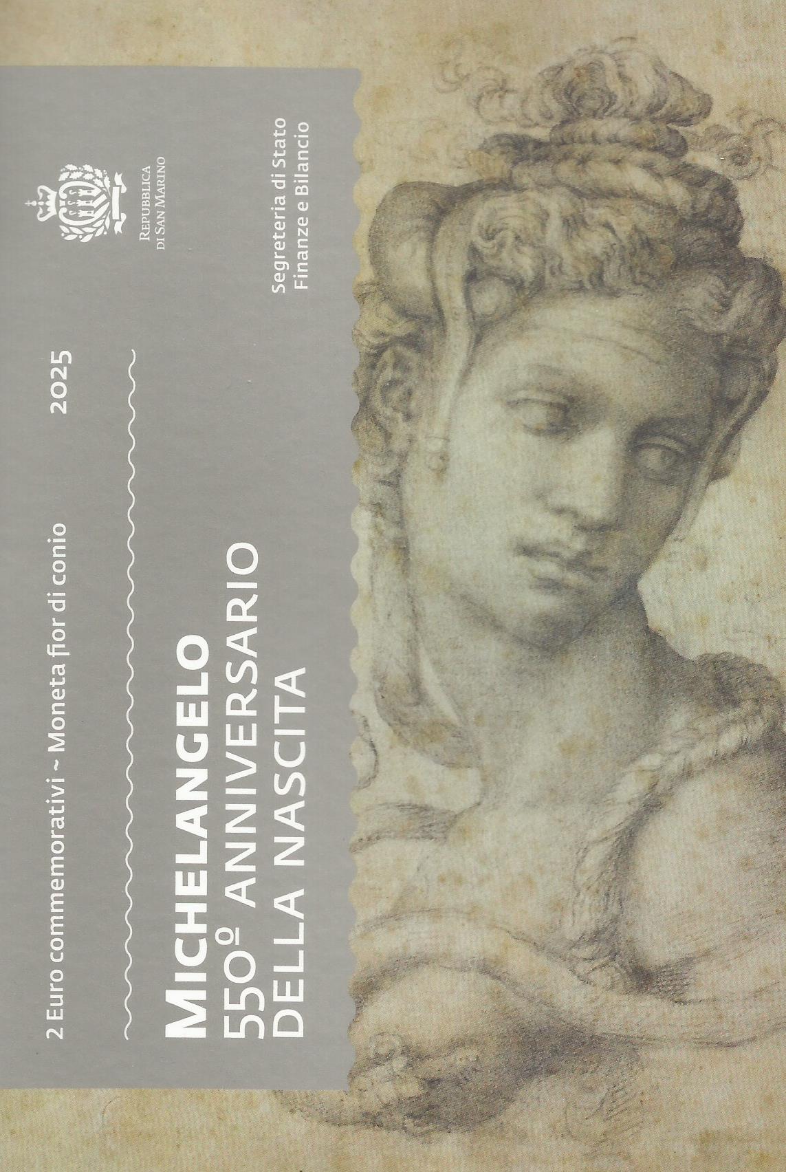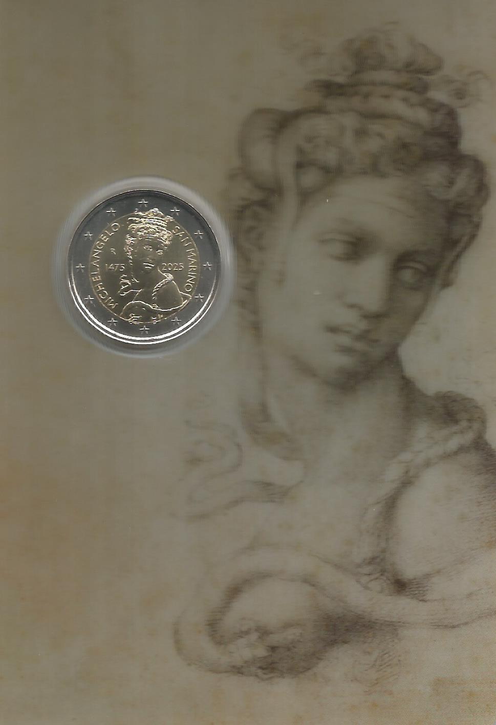 Carteira FDC - Moeda de 2 Euro de 2025 de São Marino - 550 anos nascimento Michelangelo