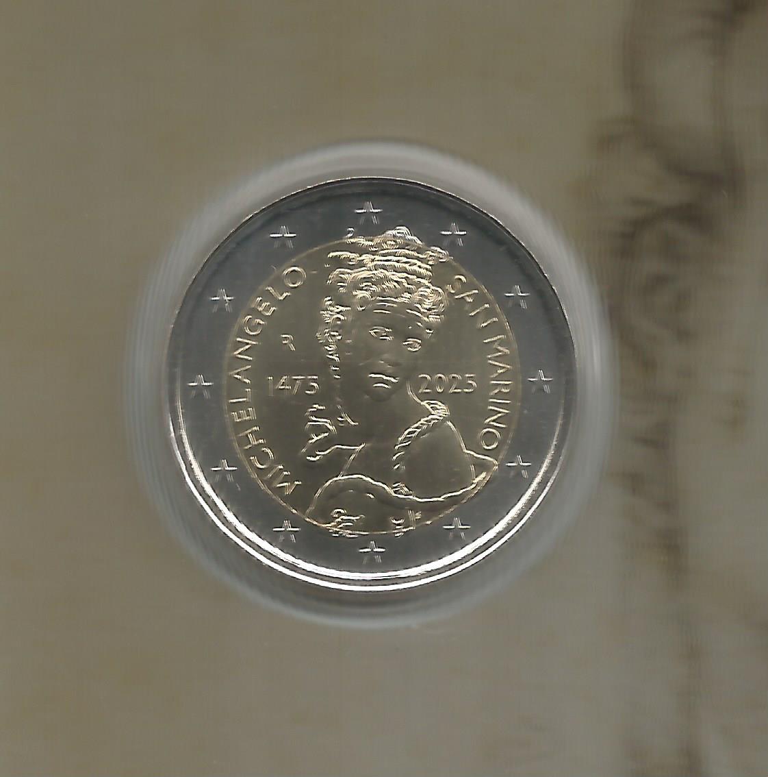 Moeda de 2 euro de 2025 de SÃO MARINO, comemorativa dos (550 anos do nascimento de Michelangelo), na carteira original da Casa da Moeda de São Marino, com acabamento, (FDC) FLÔR de CUNHO. A Moeda vem numa carteira conforme mostram as imagens. Se clicar sobre as imagens estas aumentarão de tamanho.
