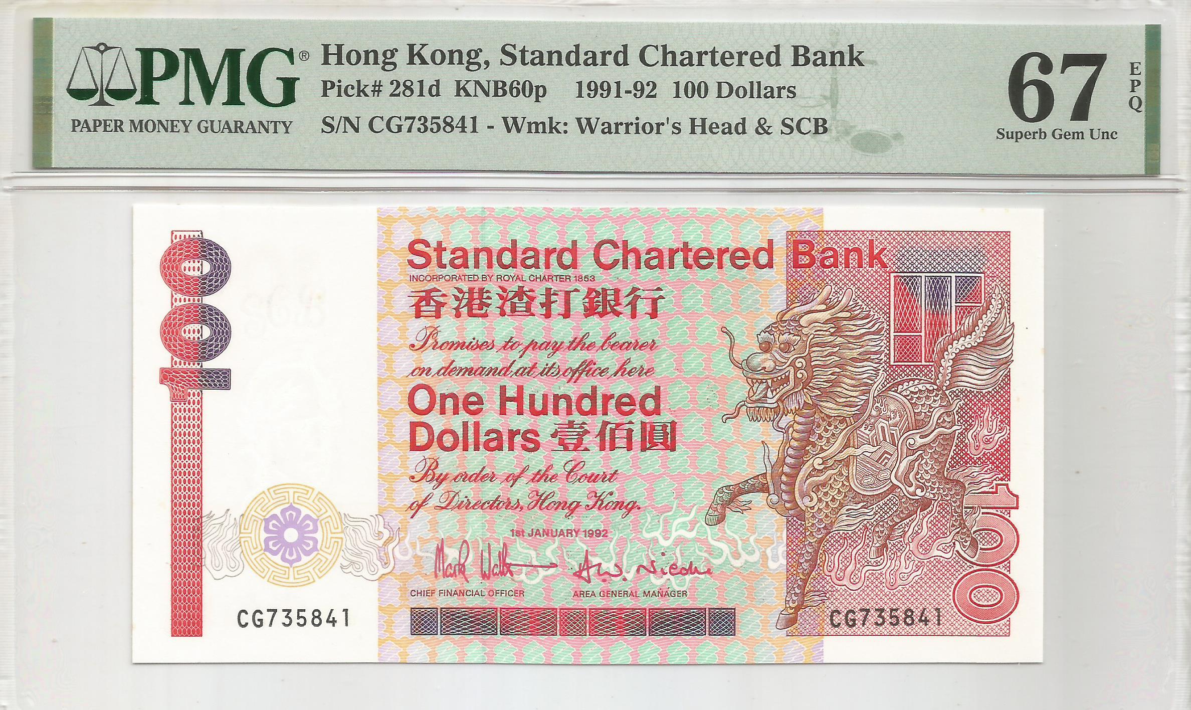 NOTA de 100 Dolares de 1992 de HONG KONG - Certificada