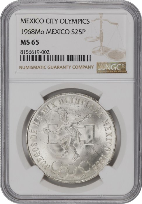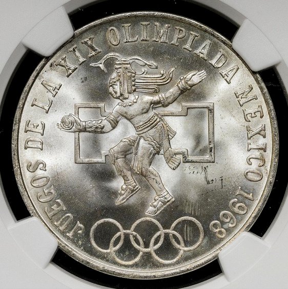 Moeda de 25 Pesos de 1968 do México em Prata, comemorativa dos (Jogos Olimpicos do México), no estado de conservação de (FLÔR de CUNHO). Moeda Certificada (NGC MS65). Por favor veja as imagens. Se clicar sobre as imagens estas aumentarão de tamanho. A Qualidade tem sempre OUTRO valor.