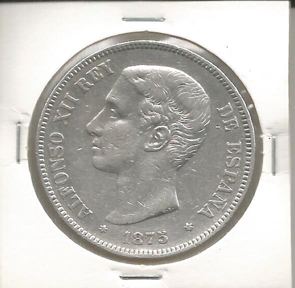 Moeda de 5 Pesetas (1 Duro) de 1875 em Prata do Rei Alfonso XII de Espanha, no estado de consercação de (MBC a MBC+). Letras D.E - M. 24,97gr. toque, 900%. As moedas de Espanha são cada dia mais dificeis de encontrar num bom estado de conservação. A moeda está linda e serve na colecção de qualquer Numismata. Por favor veja as imagens. Se clicar em cima das imagens elas aumentarão de tamanho.