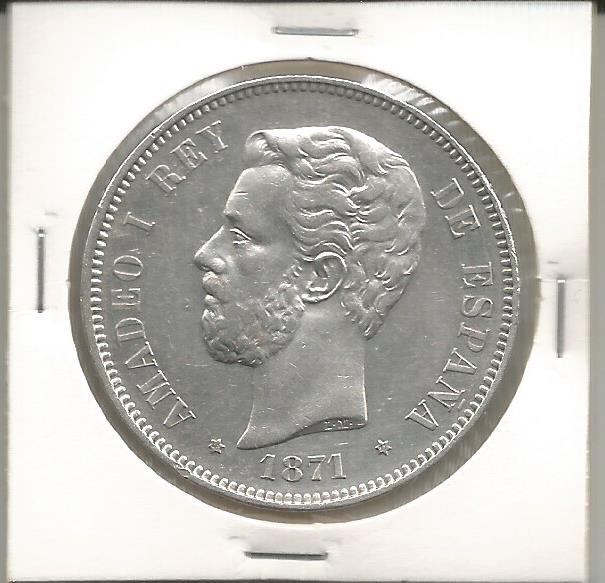 Moeda de 1 Duro (5 Pesetas) de 1871 de ESPANHA - Rei Amadeu I - PRATA