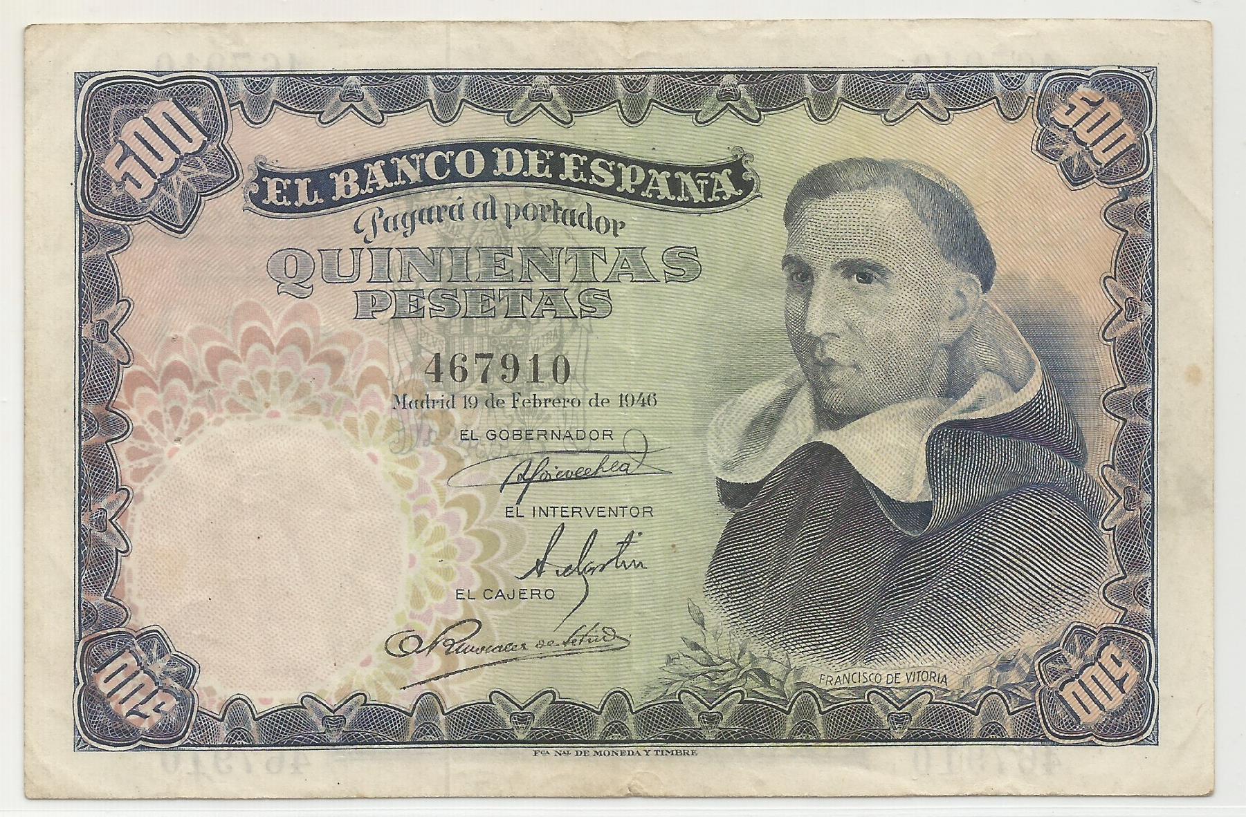 Nota de 500 Pesetas de 19 de Fevereiro de 1946 de ESPANHA, de (Francisco de Vitoria), sem série, (Ref. 132), com o número (467910), no estado de conservação de (MBC). Por favor veja as imagens. A nota tem um pequeno rasgo em baixo na dobra mas está coleccionável pois é uma data ESCASSA. Por favor vejas as imagens. Se clicar sobre as imagens estas aumentarão de tamanho.