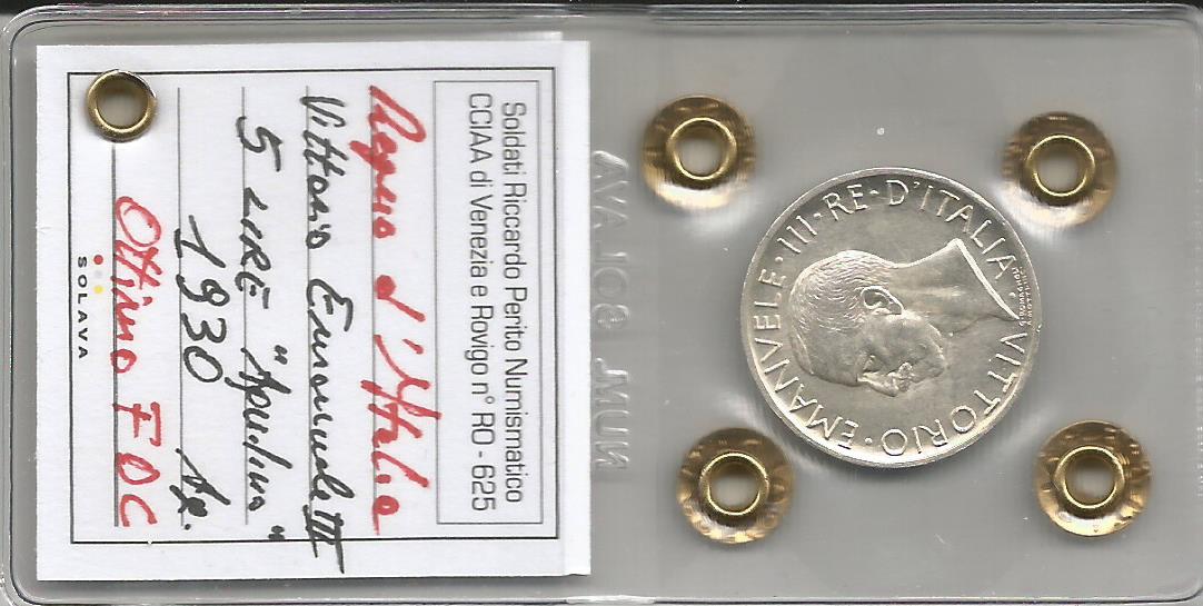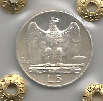 Moeda de 5 Liras de 1930 de Italia - Rei Vitor Emanuel III - Aguia Romana - CERTIFICADA